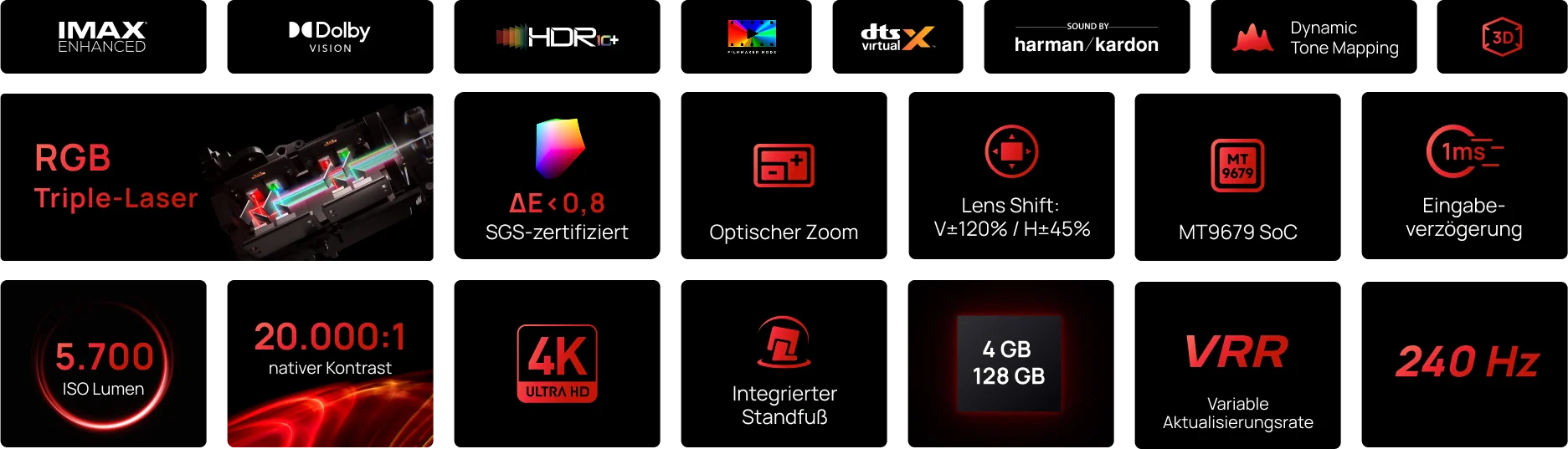 Name der Zertifizierung | IMAX Enhanced | Filmmaker Mode | HDR 10+ | Dolby Vision | Bildmerkmale | Hochwertige Bild- und Tonqualität mit Unterstützung für Breitbildformate | Geringe Sättigung für authentisches Filmkorn | Helles, kontrastreiches Bild mit hoher Farbtreue | Dynamische Bildoptimierung, Szene für Szene |