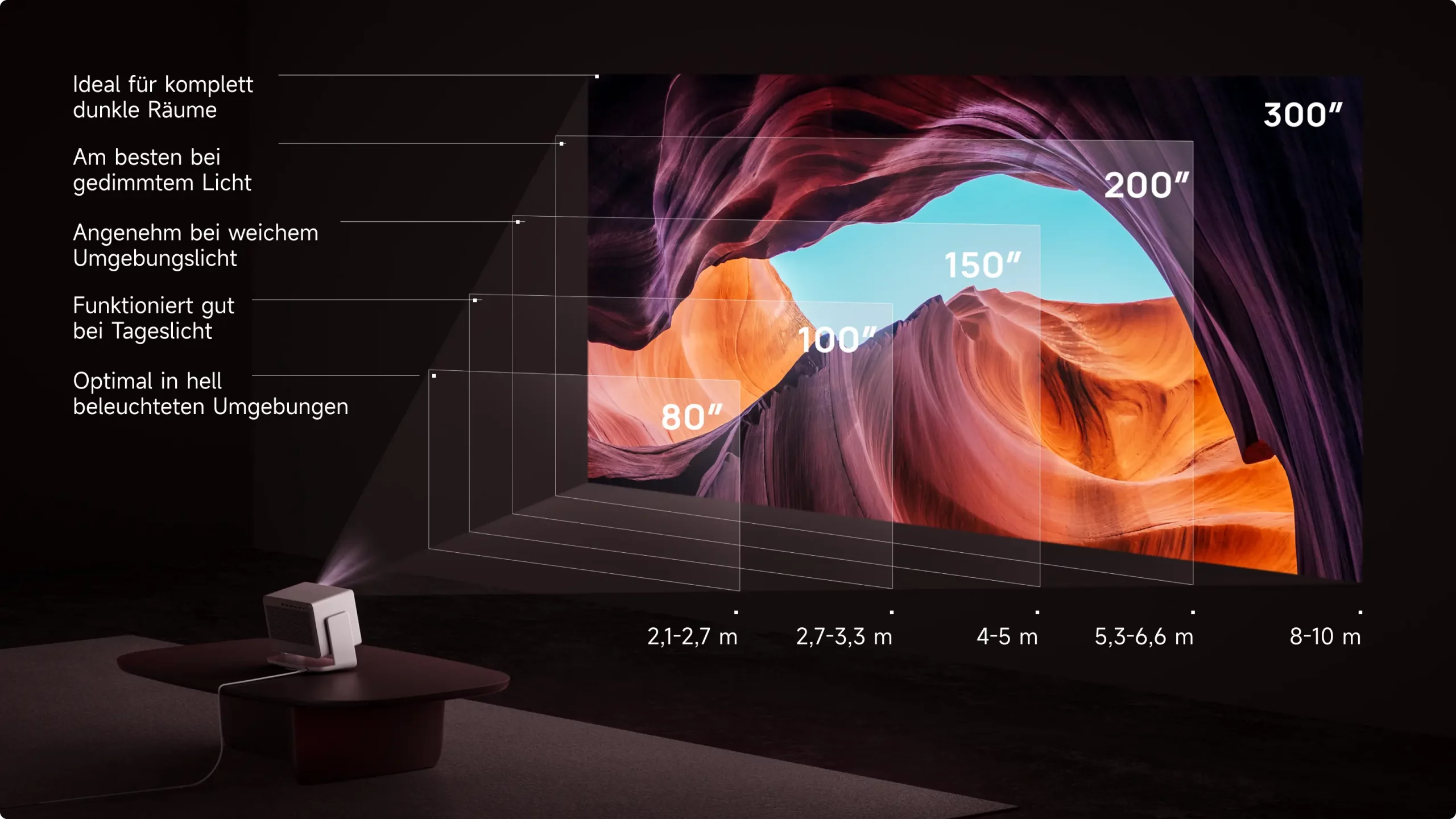 8. Für das beste Seherlebnis empfehlen wir eine Projektionsgröße von 60 bis 150 Zoll. Die Überschreitung dieses Bereichs kann die Qualität der projizierten Inhalte beeinträchtigen. Die Bildqualität kann durch die Nutzungsgewohnheiten des Produkts und die Umgebungsbedingungen beeinflusst werden.