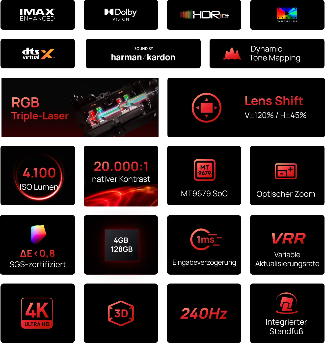 Name der Zertifizierung | IMAX Enhanced | Filmmaker Mode | HDR 10+ | Dolby Vision | Bildmerkmale | Hochwertige Bild- und Tonqualität mit Unterstützung für Breitbildformate | Geringe Sättigung für authentisches Filmkorn | Helles, kontrastreiches Bild mit hoher Farbtreue | Dynamische Bildoptimierung, Szene für Szene |