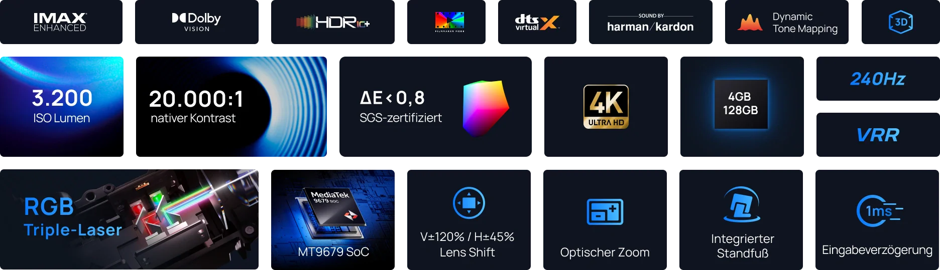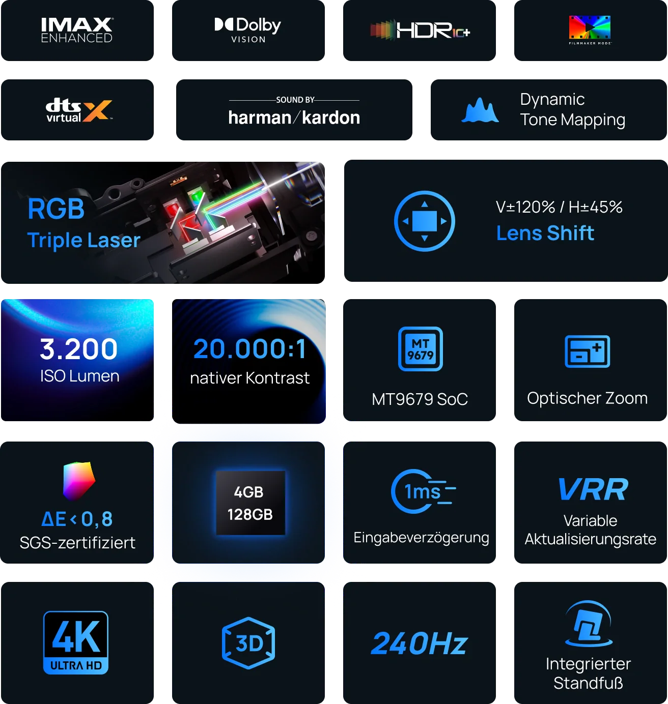 | Optik | Lens Shift & optischer Zoom Verlustfreie Schärfe aus jedem Winkel | / Keystone-Korrektur mindert Schärfe |