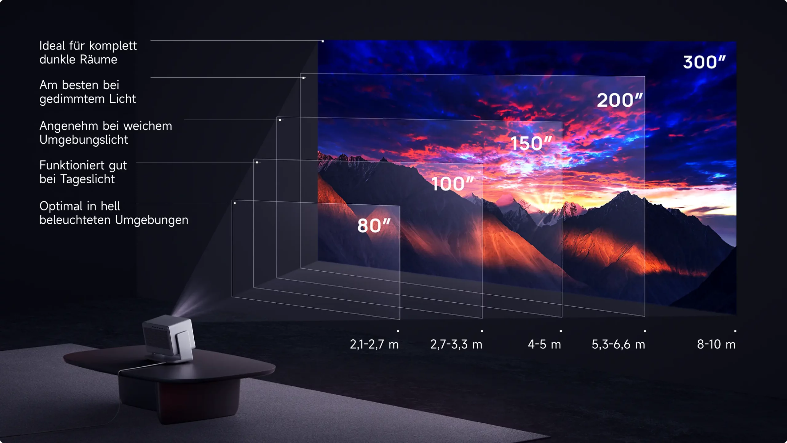 8. Für das beste Seherlebnis empfehlen wir eine Projektionsgröße von 60 bis 150 Zoll. Die Überschreitung dieses Bereichs kann die Qualität der projizierten Inhalte beeinträchtigen. Die Bildqualität kann durch die Nutzungsgewohnheiten des Produkts und die Umgebungsbedingungen beeinflusst werden.