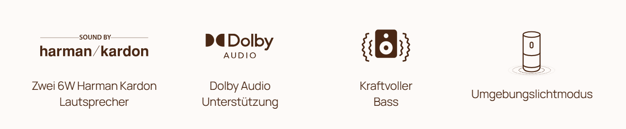 Mit zwei 6-Watt-Lautsprechern von Harman Kardon wird deine Musik zum Erlebnis: Klar, kraftvoll und raumfüllend. Kombiniert mit dem Ambient-Light-Modus entsteht genau die Stimmung, die du willst – egal wo.