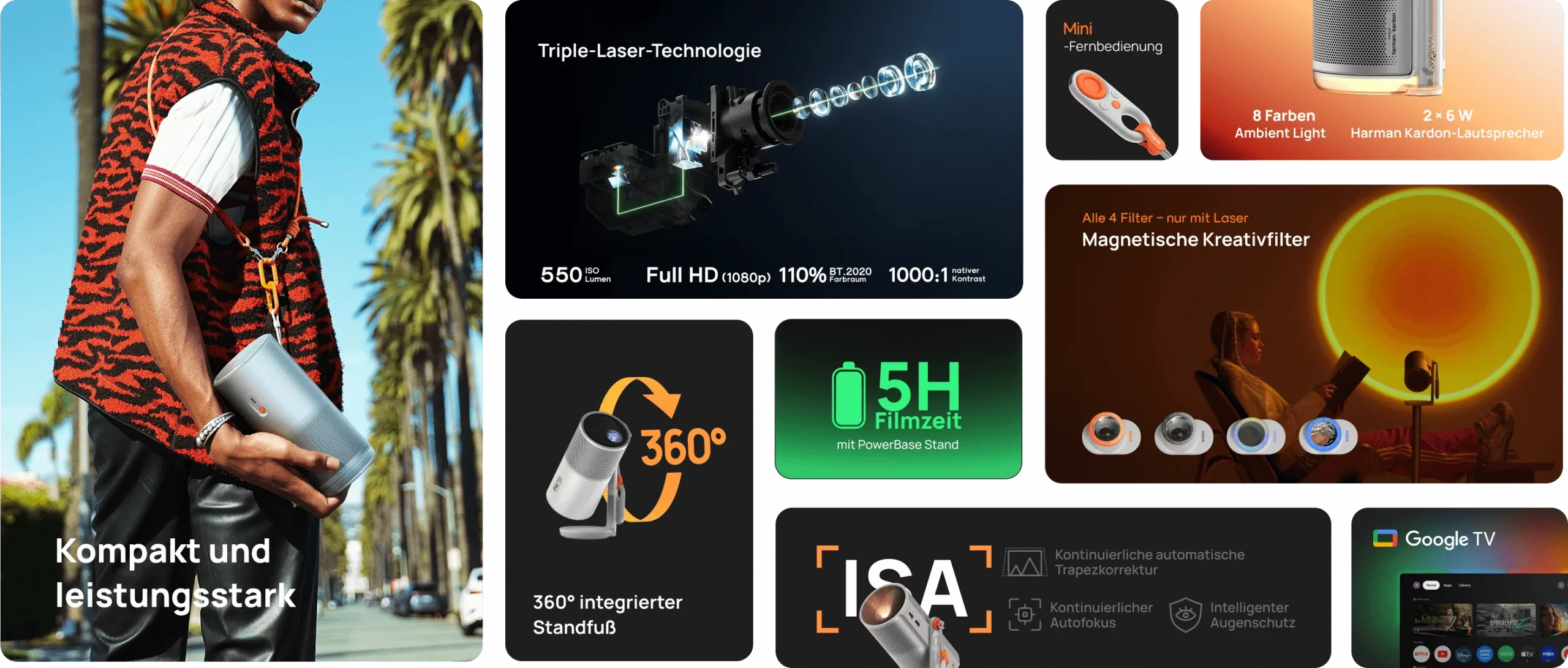 Der XGIMI MoGo 4 Laser ist ein smarter, tragbarer Projektor für alle, die flexibel bleiben wollen. Dank der kompakten Bauweise und integriertem Akku kannst du ihn einfach überall hin mitnehmen – ob für gemütliche Filmabende zu Hause, Outdoor-Sessions oder spontane Treffen mit Freunden. Das clevere magnetische Objektiv-Set für Ambient-Light zaubert ein sanftes Licht in den Raum und sorgt so für eine besonders stimmungsvolle Atmosphäre. Dazu kommen ein halbtransparenter Standfuß, modernste Porjektionstechnik von XGMI und satter Sound von Harman/Kardon – für ein Erlebnis, das alle Sinne anspricht. So setzt der MoGo 4 Laser neue Maßstäbe in seiner Klasse.