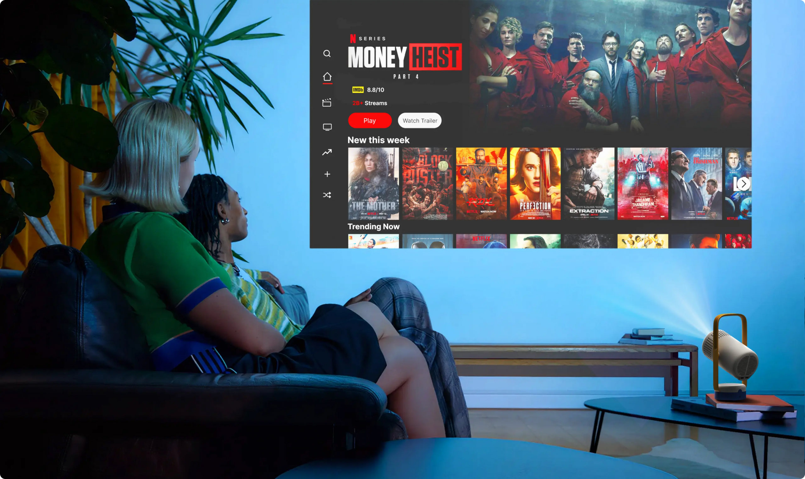 Mit integriertem Netflix und Google TV ist der Vibe One (mit Akku) perfekt, um runterzukommen und deine Lieblingsserie im Großformat zu genießen.